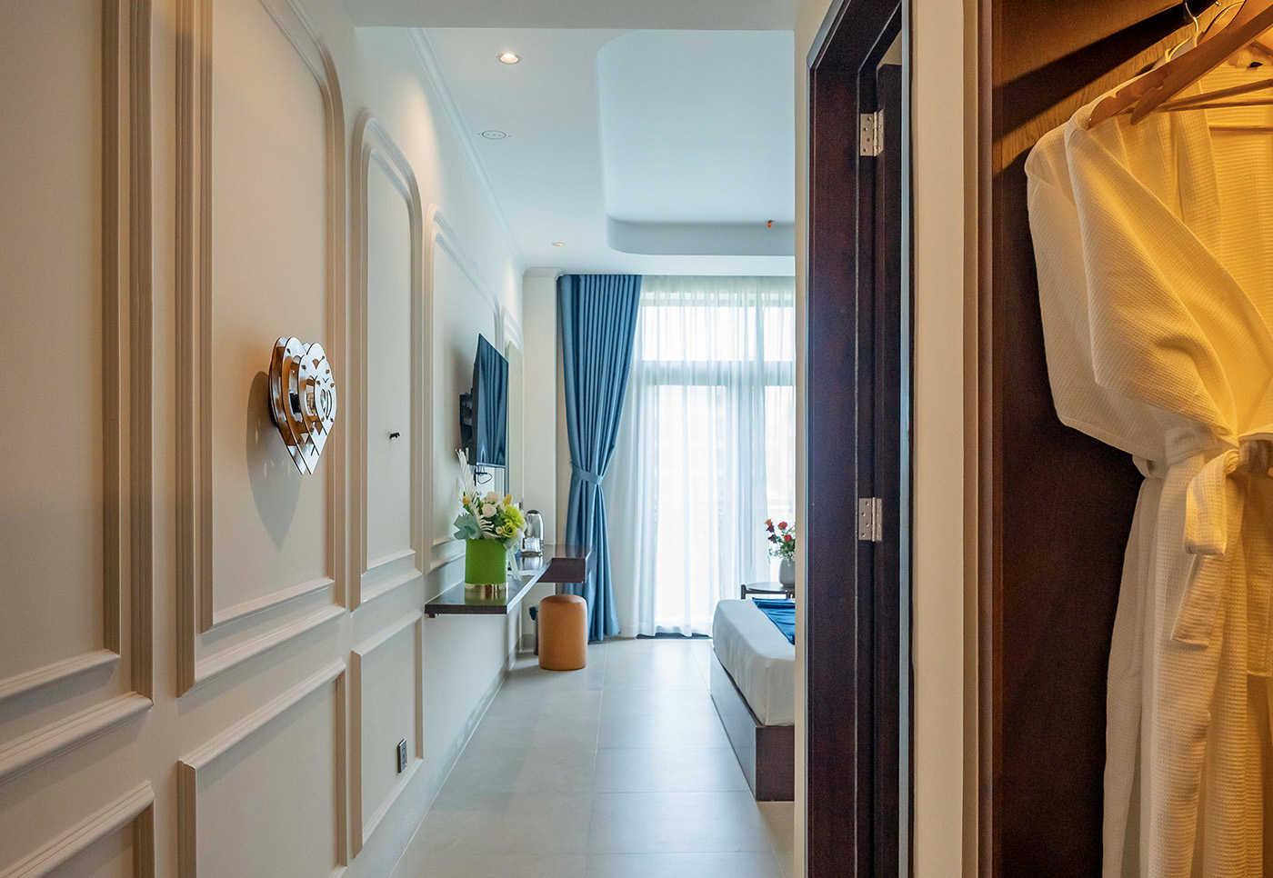 Phòng Deluxe Ocean View được thiết kế với phong cách hiện đại, phối hợp hài hòa giữa màu sắc và ánh sáng, tạo nên không gian ấm cúng, dễ chịu. Mỗi chi tiết trong phòng đều được chọn lọc kỹ lưỡng để mang lại cảm giác sang trọng và thư giãn, từ sàn gỗ, rèm cửa đến đèn ngủ êm dịu.