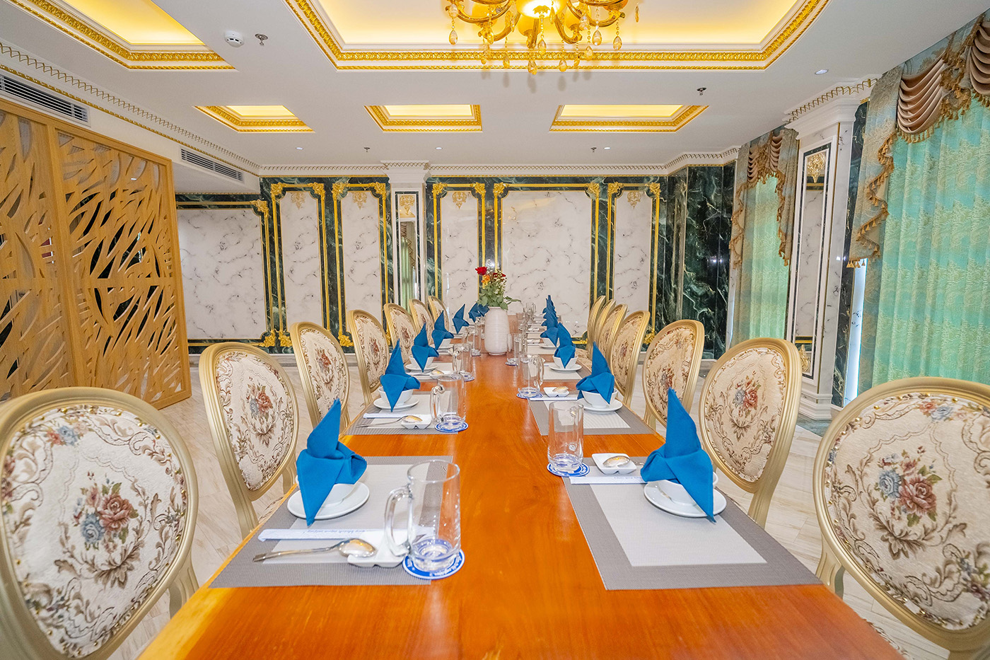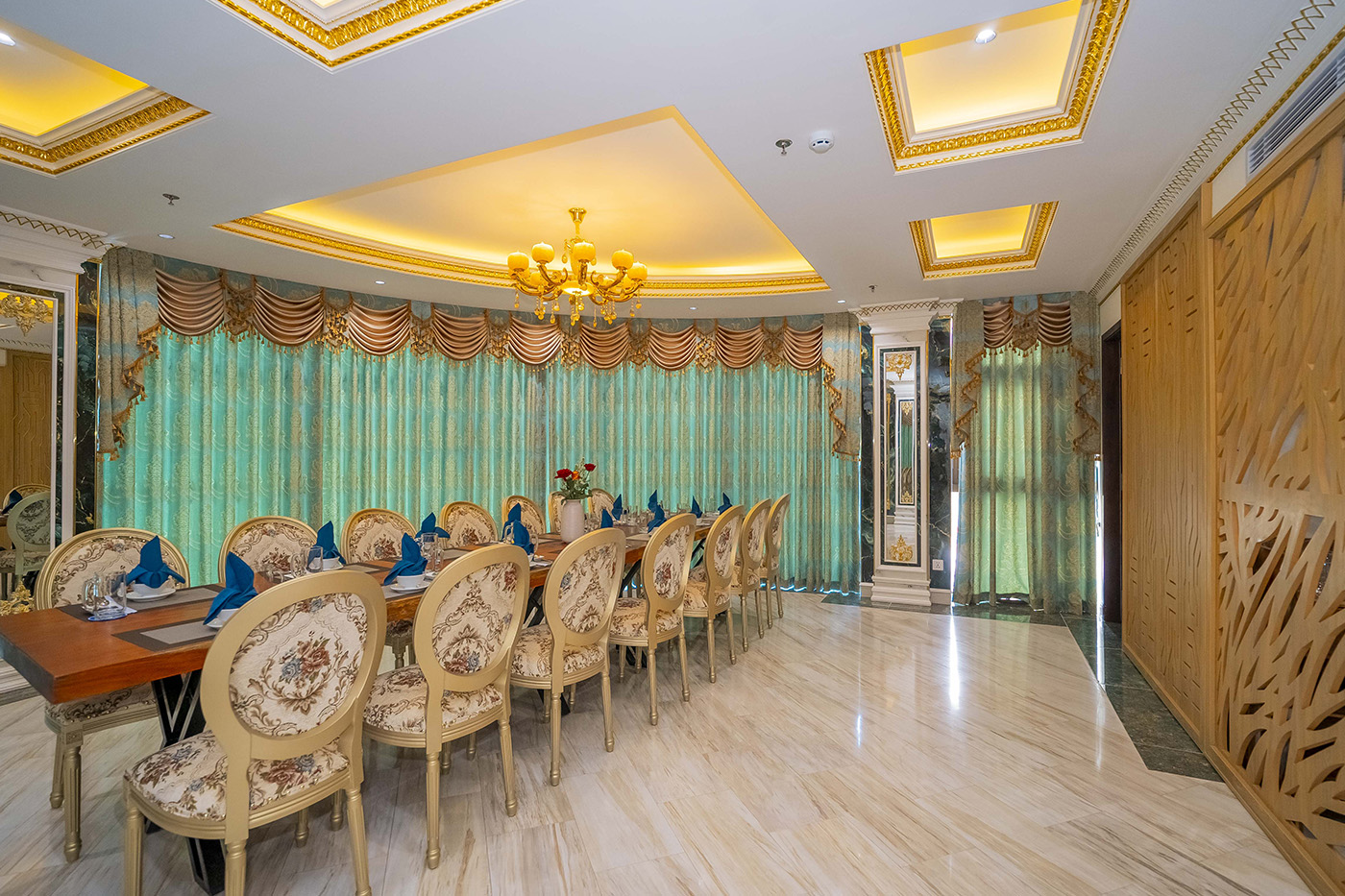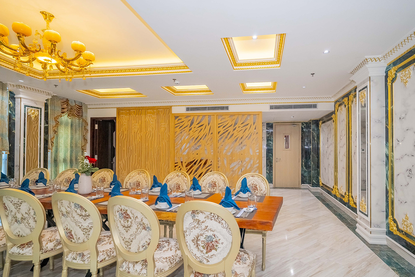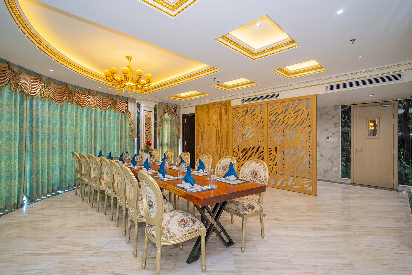 Được thiết kế lấy cảm hứng từ nhịp sống hiện đại, sôi động nhưng vẫn giữ nét tinh tế và sang trọng của Sài Gòn, Phòng Vip – Sài Gòn tại Grand Phan Thiết mang đến một không gian ẩm thực đẳng cấp, lý tưởng cho những buổi gặp gỡ riêng tư, tiệc tiếp khách quan trọng hay những khoảnh khắc đáng nhớ bên gia đình, bạn bè.